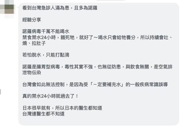 網傳「看到台灣急診人滿為患,且多為諾羅」為開頭的貼文,提到諾羅病毒千萬不能喝水,禁食禁水 24 小時,餓死病毒的說法。但專家表示,感染諾羅又吐又拉、一定要注意補充水分,但最好避免「純水」、儘量補充「電解質補充液」或是「運動飲料」,「電解質補充液」藥局買得到。傳言說法故意講的好像有一點點對、但實際上根本錯誤理解正確的疾病知識,傳言為錯誤資訊。