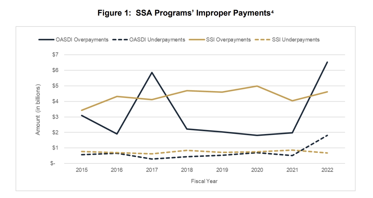 不當支付(Improper payments)可能有兩種情況:多付跟少付,而調查結果發現,社會安全局每年發放超過 1 兆美元的福利金,例如從 2015 財政年度至 2022 財政年度,社會安全局一共發放 8.6 兆美元,其中約有 718 億美元(0.84%)屬於不當支付,且大部分是超額支付。