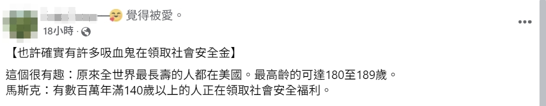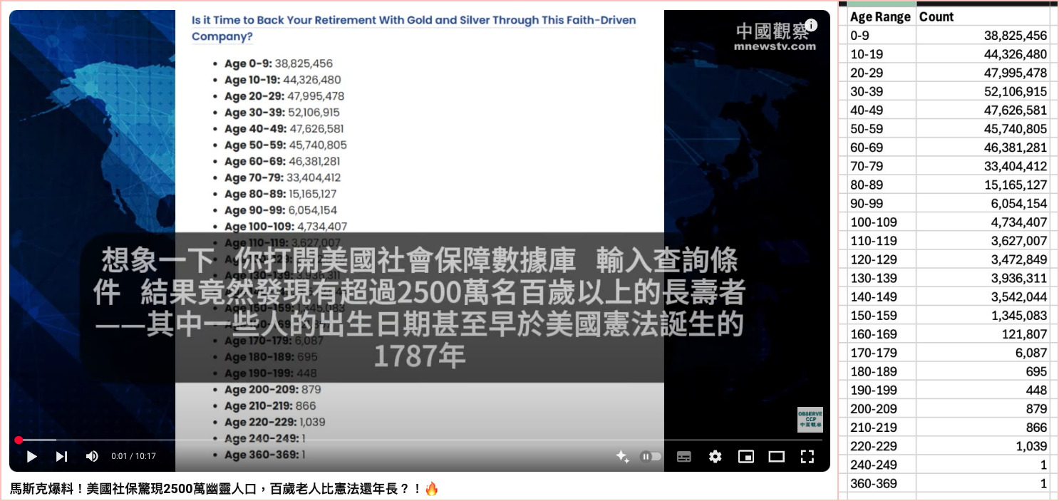 網傳「美國有超過 2,500 萬名百歲長者」的影片及訊息,內容聲稱馬斯克近期表示,有數百萬年每 140 歲以上的人,正在領取美國社會安全局(SSA)發放的福利金。經查證,馬斯克曾提到社會安全局的「社會保障」(Social Security)系統有出現 150 歲的人,並附上一張年齡層分布圖,但他沒有解釋圖表的意義,也沒有說過「數百萬 140 歲以上人口在領福利金」這句話。社會安全局的系統中出現許多年齡百歲的人,這些人幾乎都沒有收過福利金,只是死亡紀錄未更新;歷年來確實都有不當支付(Improper payments)的情況發生,但整體占比不到 1%,該局自 2015 年 9 月即規定年齡 115 歲以上停止支付福利金,因此不太可能出現百萬或是千萬超過百歲的人還在領錢,網傳訊息過度簡化社會安全局數據的背景脈絡,容易造成民眾誤解。