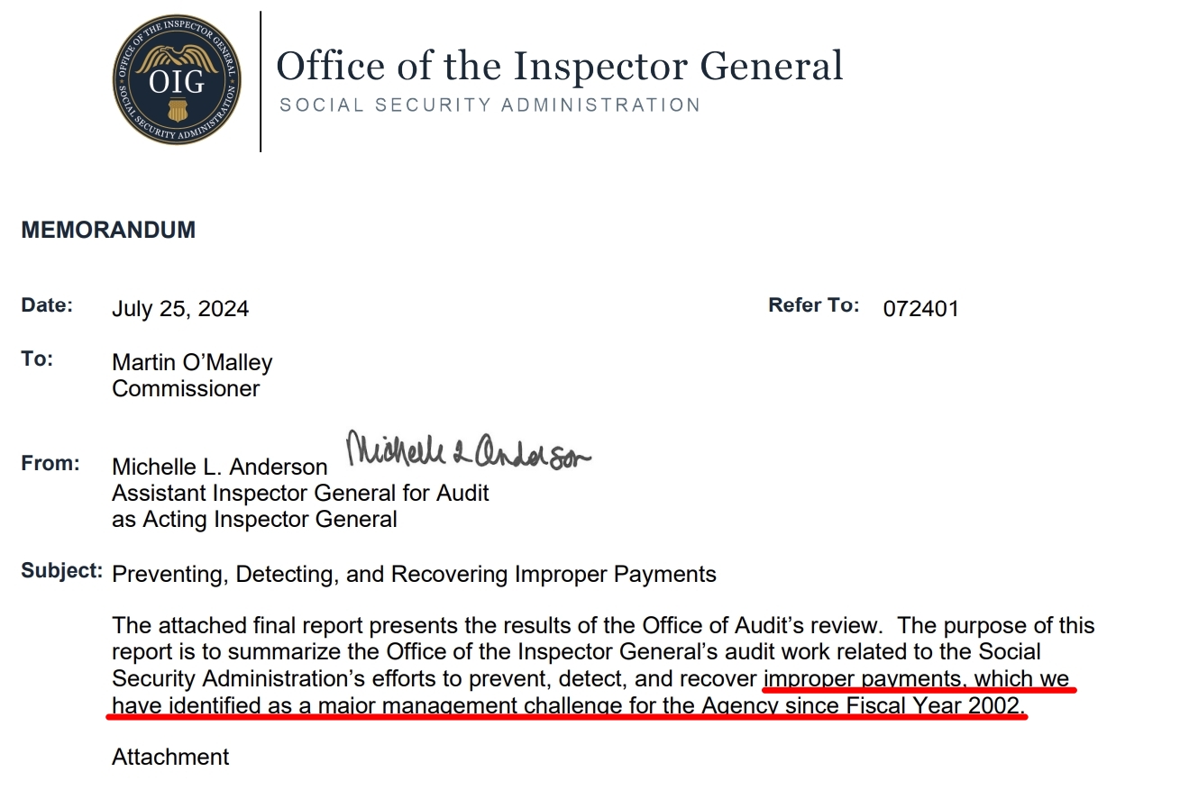 根據社會安全局監察長辦公室於 2024 年 7 月出版的報告《預防、檢測及追討不當支付》(Preventing, Detecting, and Recovering Improper Payments),可以看到報告主旨提到這是社會安全局自 2002 年以來,在管理上遇到的重大挑戰。