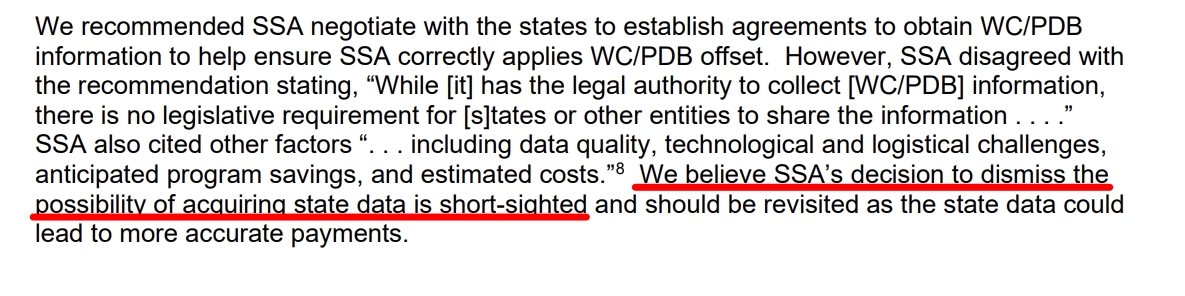由於事前預防效益遠大於事後補救,報告建議社會安全局應與各州政府協商,收集 WC/PDB 數據,而不是靠受益人自己回報。但社會安全局表示,他們確實有收集數據的權力,但沒有法律要求各州必須分享這些資訊;此外,要把各州數據整合進社會安全局的資料庫,在技術及後勤方面有困難,且成本效益難以評估,也就是無法確定整合後不當支付減少的金額,是否會比整合時所需的花費多,因此不同意這項建議。