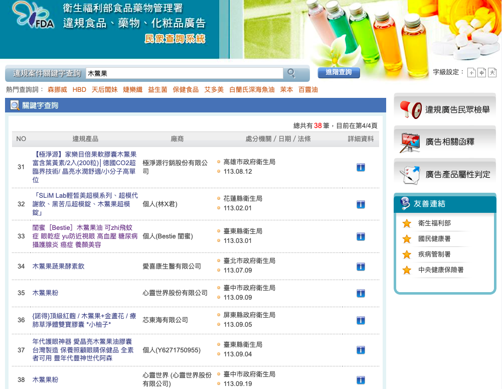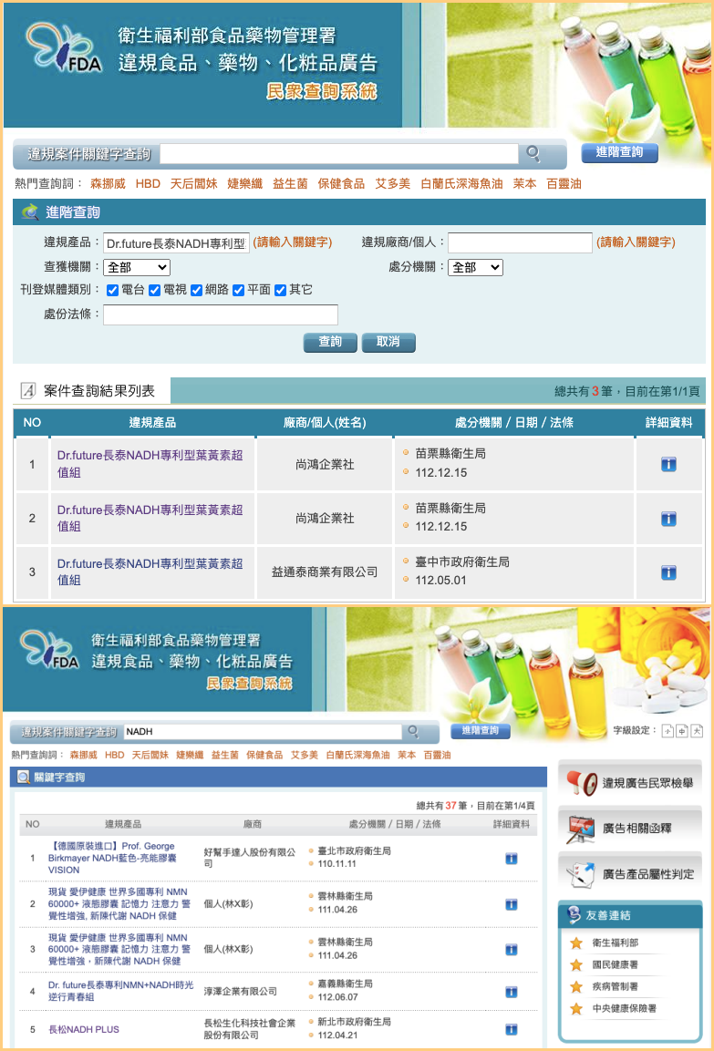 MyGoPen 以傳言的產品查詢、累積共有 3 筆違規紀錄。若以關鍵字「NADH」查詢,則有37 筆違規紀錄,產品名稱包括「時光逆行青春組」,以及「記憶力」、「新陳代謝」、「關鍵活力」、「超能新生」、「激活素細胞」等。