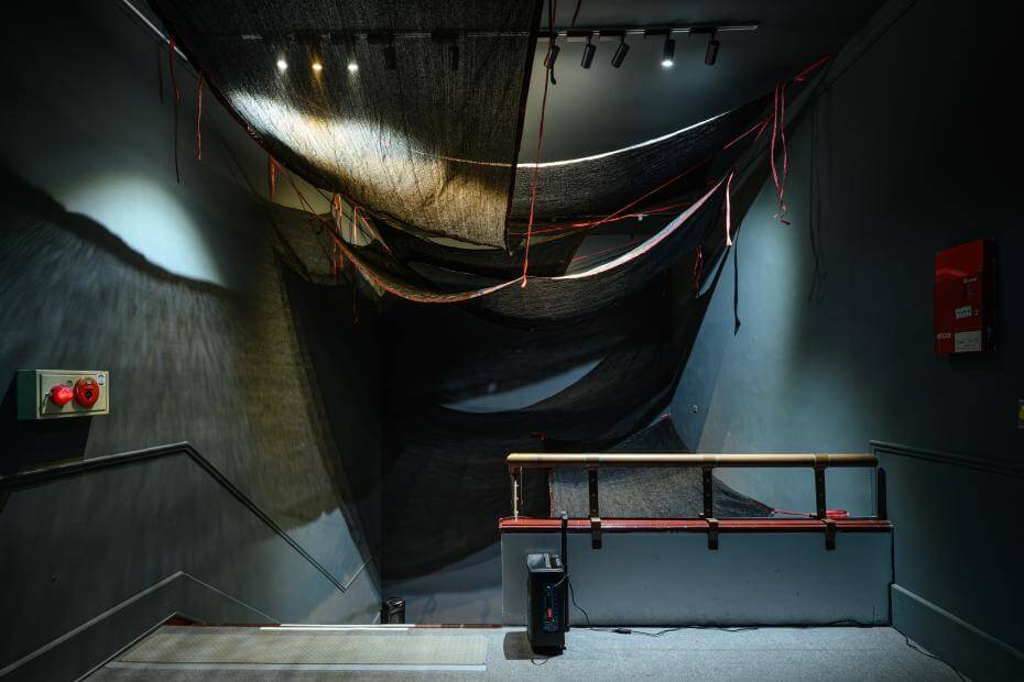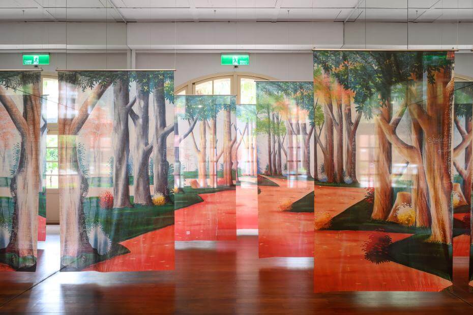 在展覽入口處敞開的是一條巨幅布幔,繪製一座山林草木豐盛的景象,似踏入林班工人勞動血汗的叢林、殖民經濟的砍伐場或冷戰下沒入叢林的隱居地,這場展覽就從這座藏納歷史回聲的山林入口揭開序幕。