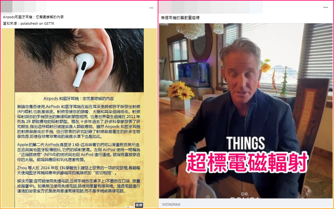 網傳「為何我從不使用無線耳機」貼文及圖卡,轉傳的不同版本中提到無線耳機會造成包括腦、神經、心血管、生殖系統、癌症等疾病。但無線藍牙耳機的功率非常低、最高值的功率通常是 1 毫瓦,而手機的最大功率約為 250 毫瓦,根據國際事實查核單位、以及世衛等具有代表性的專業機構,都表示目前沒有足夠的證據能證實低強度的電磁波會造成健康危害,例如世衛就表示:「過去 30 年已發表了大約 2 萬 5000 篇研究,大量研究顯示電磁場是無害的,雖然科學還不能保證絕對安全,但研究的發展總體上是令人放心的」。