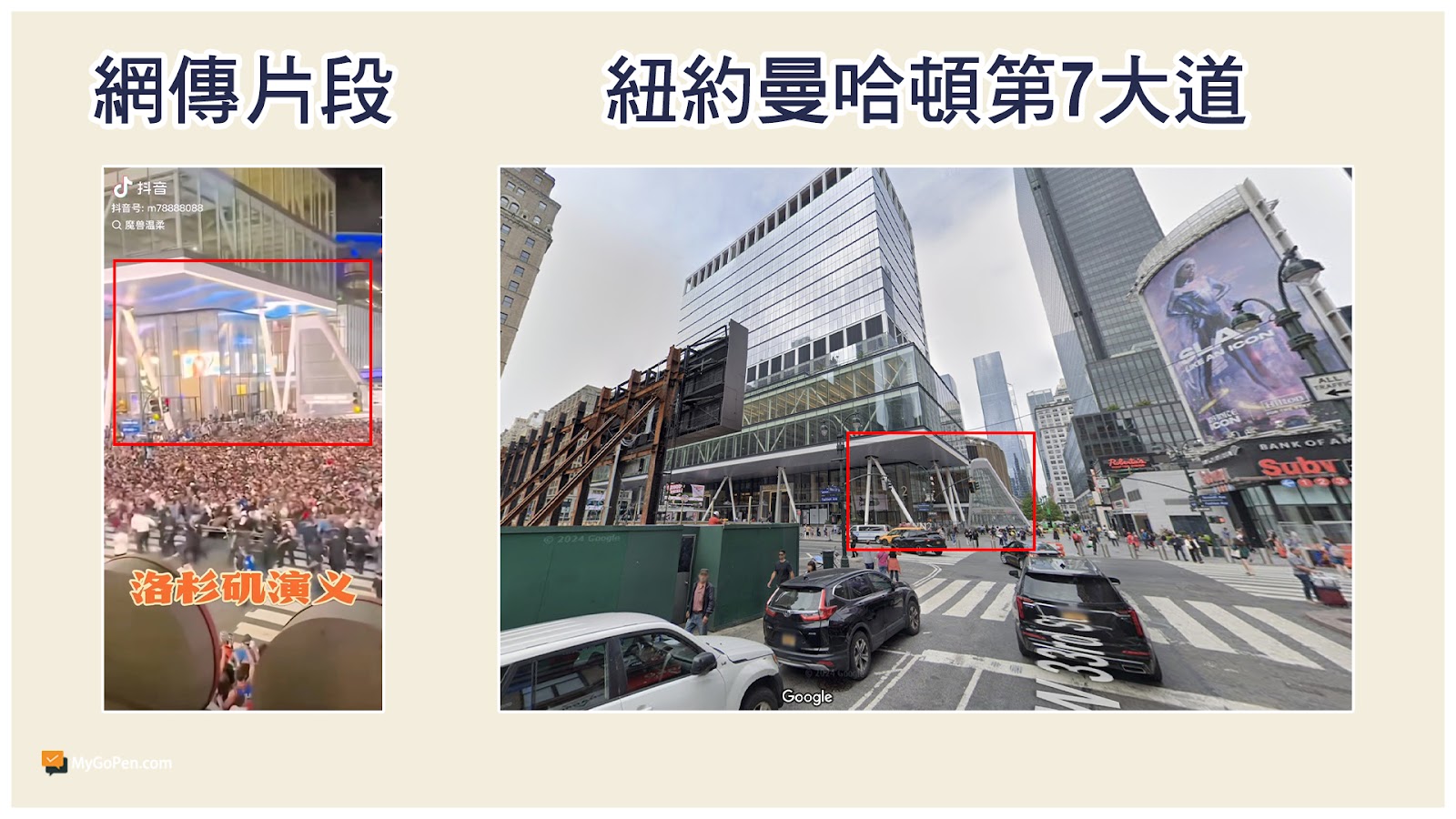 利用圖片反搜工具「Google Lens」進行搜索,可以找到 Instagram 用戶「newyorkers」於 2025 年 5 月 18 日發布的影片,內容提到影片拍攝地點是在「MSG」外頭,MSG 是「麥迪遜花園廣場」(Madison Square Garden)的縮寫,利用Google Maps 街景功能進行搜索,確認影片是在紐約曼哈頓第 7 大道與西 33 街交叉口拍攝,並非洛杉磯