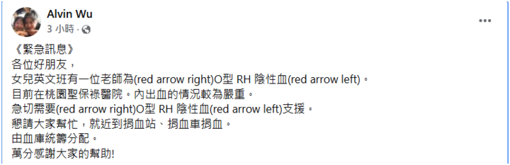 《緊急訊息》 各位好朋友, 女兒英文班有一位老師為(red arrow right)O型 RH 陰性血(red arrow left)。 目前在桃園聖保祿醫院。內出血的情況較為嚴重。 急切需要(red arrow right)O型 RH 陰性血(red arrow left)支援。 懇請大家幫忙,就近到捐血站、捐血車捐血。 由血庫統籌分配。 萬分感謝大家的幫助!