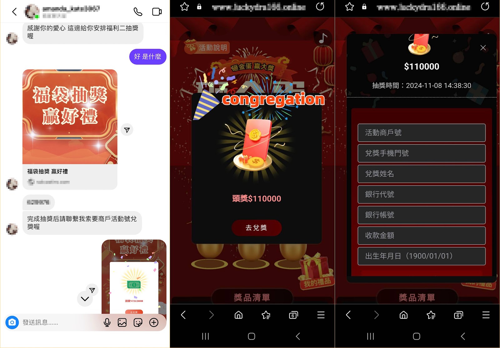 這個手法主要取信於被害人,會要求你提供個人資料,例如姓名、電話、地址、銀行帳戶等,甚至要求你支付一筆小額費用,話術有像是「為了支付代購費、海關稅金或捐款給公益團體」等說法,詐騙集團會刻意選擇真實存在的公益團體,將領獎流程複雜化,讓你放下戒心與警覺性。
