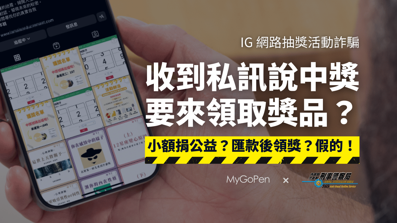 近期 IG 上出現許多讓人眼花撩亂的抽獎活動,其中可能暗藏著詐騙集團的陷阱。利用人們貪小便宜的心態,設計出各種誘人的獎品,在 Instagram 會私訊用戶說「你中獎了」,要求被害人小額捐款給公益團體增加可信度,最後藉由各種理由,看似支付合理的額外費用,進而騙你匯款或是騙取提款卡、銀行帳戶等個人資料。提醒民眾切勿輕易相信不明的中獎通知。