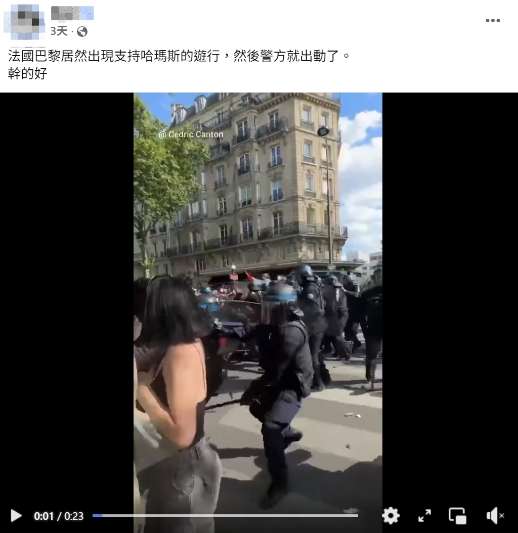 網傳「法國出現支持哈瑪斯遊行」的影片及訊息,內容聲稱法國巴黎近期出現支持哈瑪斯的遊行,而警方則出動並毆打支持群眾。經查證,網傳影片拍攝於 2025 年 5 月 1 日,由法國網路記者上傳,原始貼文僅提到法國警方毆打並逮捕抗議者,並無任何與巴勒斯坦或哈瑪斯相關的內容。巴黎五一勞動節遊行是由法國工會主辦,主要訴求包括反對退休金改革、調高薪資及保障工作等,雖然當天也有民眾持巴勒斯坦國旗上街,但基本上並非五一遊行的宗旨,傳言把法國警方毆打抗議民眾的畫面,描繪成抗議民眾是因為支持巴勒斯坦或哈瑪斯才被打,屬於過度解讀,與實際情況不符。
