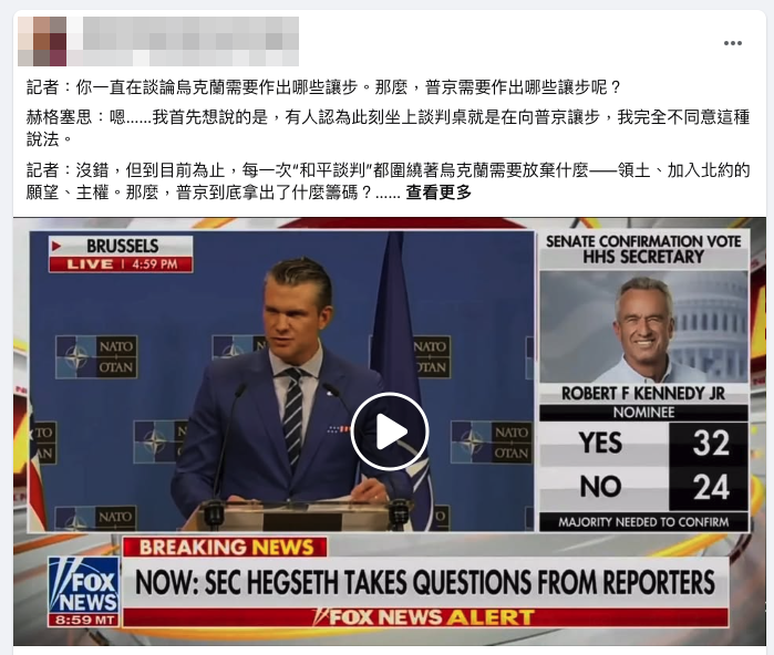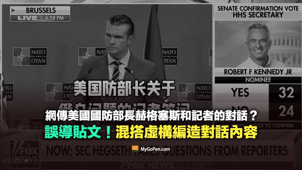 網傳「記者:你一直在談論烏克蘭需要作出哪些讓步。那麼,普京需要作出哪些讓步呢」,關於美國國防部長赫格塞斯和記者對話的文章和影片。經查證,傳言影片是美國國防部在 2025 年 2 月 13 日召開的記者會,當時是美國國防部長赫格塞斯出訪北約,並參加北約成員國的國防部長會談之後回到美國,記者會主要在解釋會談上的情況,傳言文章僅一小部分是記者會上的真實對話,後面的內容均為虛構編造,為誤導訊息。