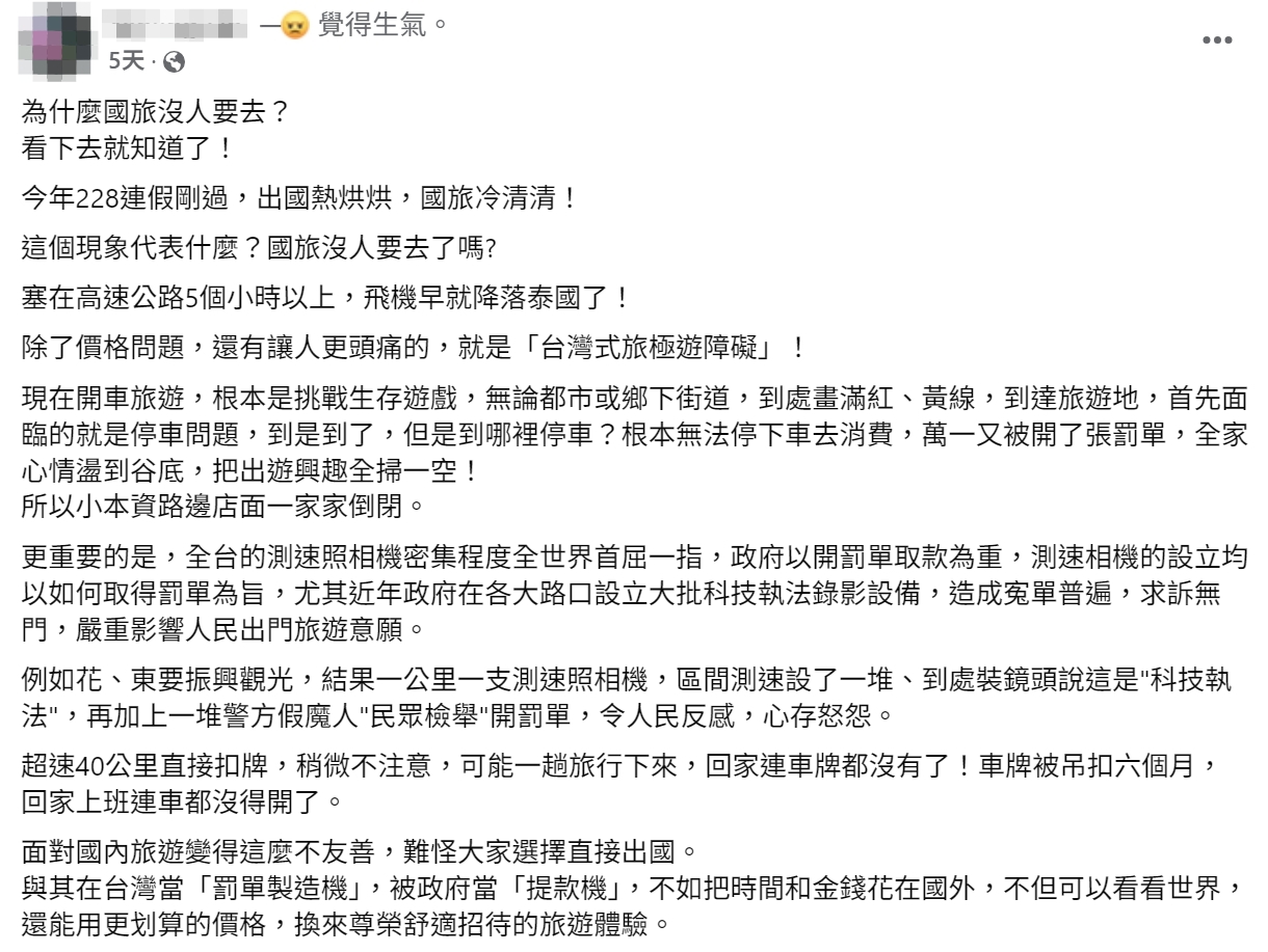 今年228連假剛過,出國熱烘烘,國旅冷清清! 這個現象代表什麼?國旅沒人要去了嗎? 塞在高速公路5個小時以上,飛機早就降落泰國了! 除了價格問題,還有讓人更頭痛的,「台灣式旅遊障礙」 現在開車旅遊,根本是挑戰生存遊戲,無論都市或鄉下街道,(到處畫滿紅黃線),根本無法停車消費。 所以小本資路邊店面一家家倒閉。 測速照相機密集程度,直逼都市監視器 (測速照相治百病) 花、東要振興觀光,結果一公里一支測速照相機,區間測速設了一堆、到處裝鏡頭說這是"科技執法",再加上一堆魔人"民眾檢舉"。 超速40公里直接扣牌,稍微不注意,可能一趟旅行下來,回家連車牌都沒有了!(車牌被吊扣六個月),回家上班連車都沒得開了。 面對國內旅遊變得這麼不友善,難怪大家選擇直接出國 與其在台灣當「罰單製造機」,被政府當「提款機」,不如把時間和金錢花在國外,不但可以看看世界,還能用更划算的價格,換來尊榮舒適招待的旅遊體驗。 未來如果國旅環境沒有改善,恐怕會有更多人選擇把連假當成「出國日」,國內旅遊市場只會更慘淡。 真不知現在坐在辦公室的官員,腦袋是怎麼想的