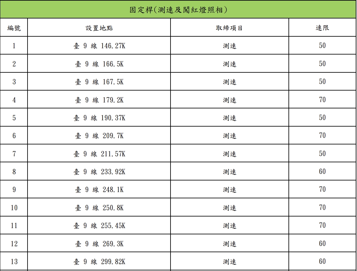 臺東縣警察局 - 固定式取締違規照相桿暨科技執法偵測設置地點一覽表