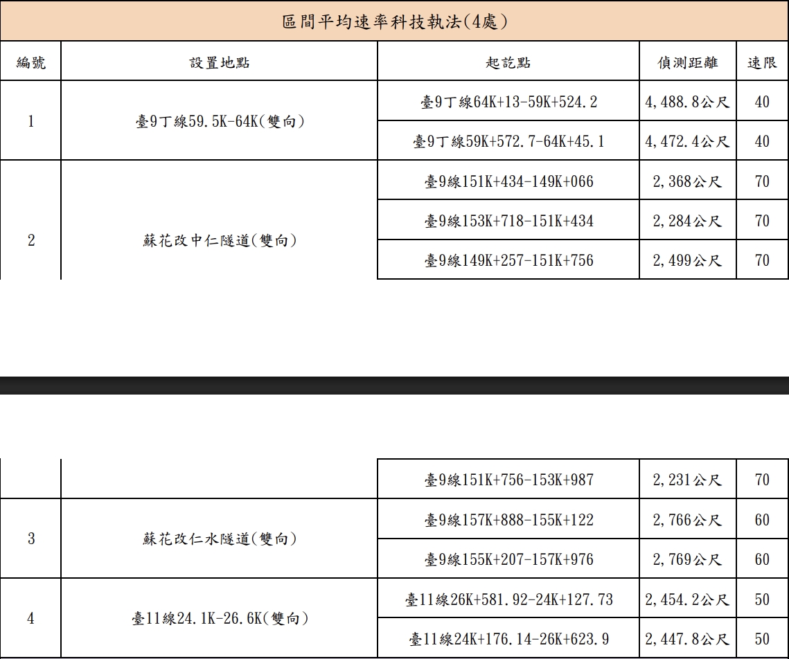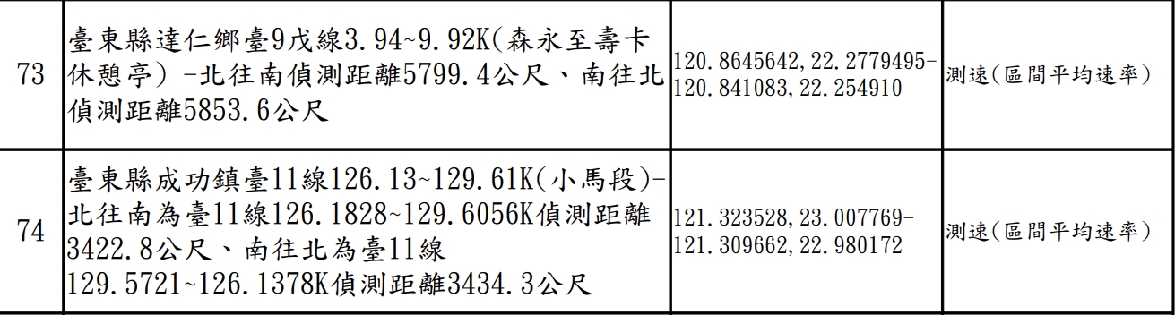 不過從設置的距離可以清楚看到,只有編號 1、編號 2 設置距離差 1 公里,以及編號 9、編號 10 差 2 公里外,其餘測速照相的設置地點都相距超過 5 公里以上,並沒有「1 公里 1 支測速照相機」的情況發生。