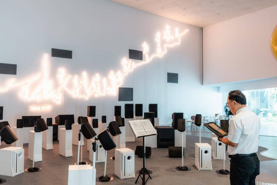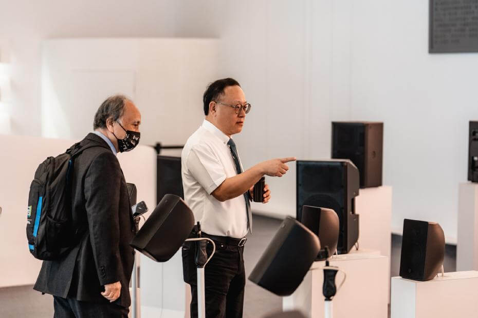 史哲細數2017年錄音作業底定後,便一路設想發表場域,最先便是想到典雅寬敞的高美館大廳以及展間,也在駁二港邊倉庫測試過,期間皆因檔期、環境音以及後來的疫情因素影響暫時擱置。直到去年11月阿蘭.馮榭私人旅遊走訪高雄,赫然發現內惟藝術中心可能正是最佳裝置場域。史哲笑著說,彷彿作品自己在選擇一個適合的場地。而這件作品的加入,不但彰顯了建築特殊聲學空間,強化內惟藝術中心沒有藩籬與邊界的藝術體驗精神,更是高雄市推動文化平權、文化近用的具體展現。