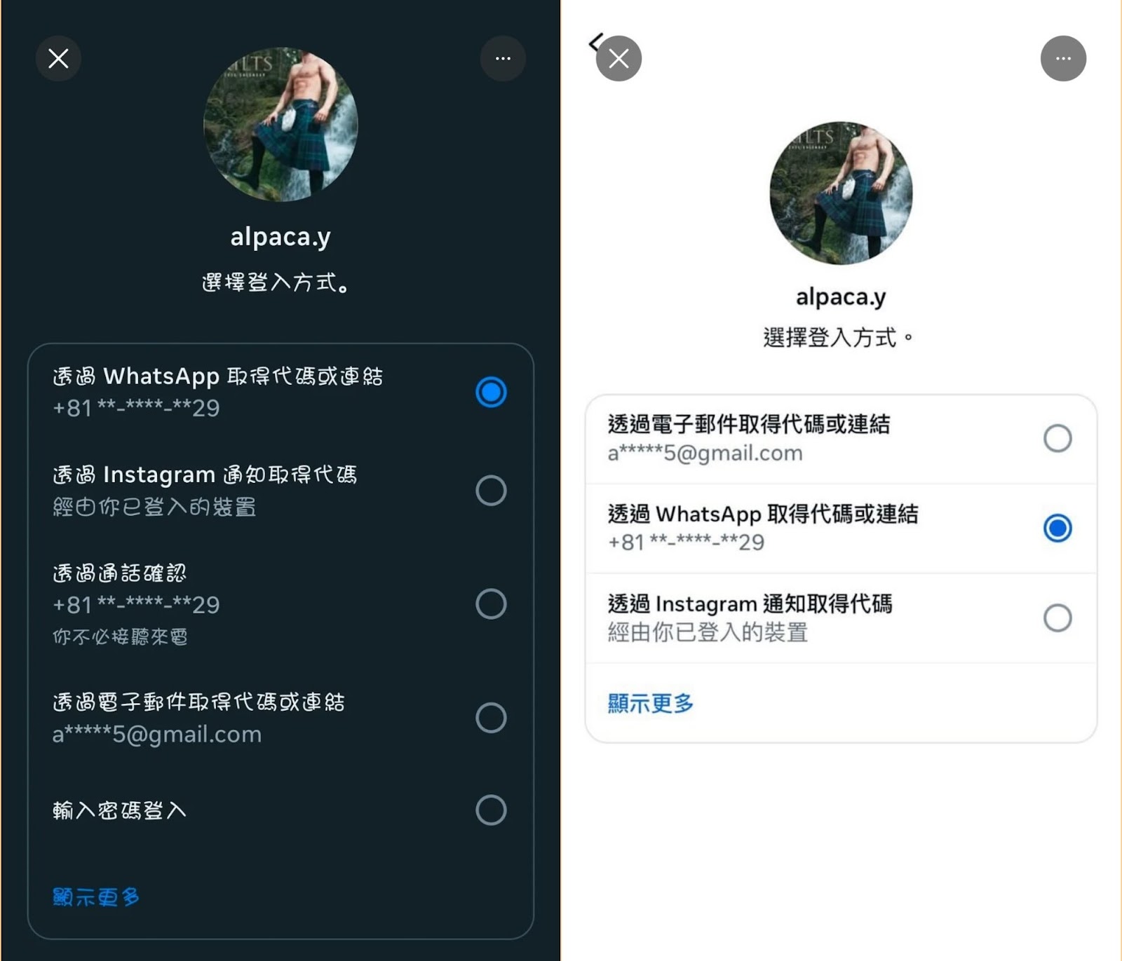 然而,透過社群平台「忘記密碼/登入」的機制檢視該帳號的綁定資訊(如讀者提供之截圖),發現該帳號綁定的手機號碼國碼為 +81。