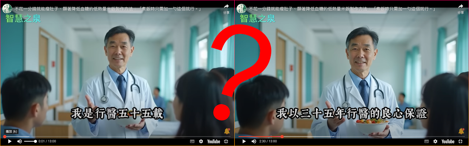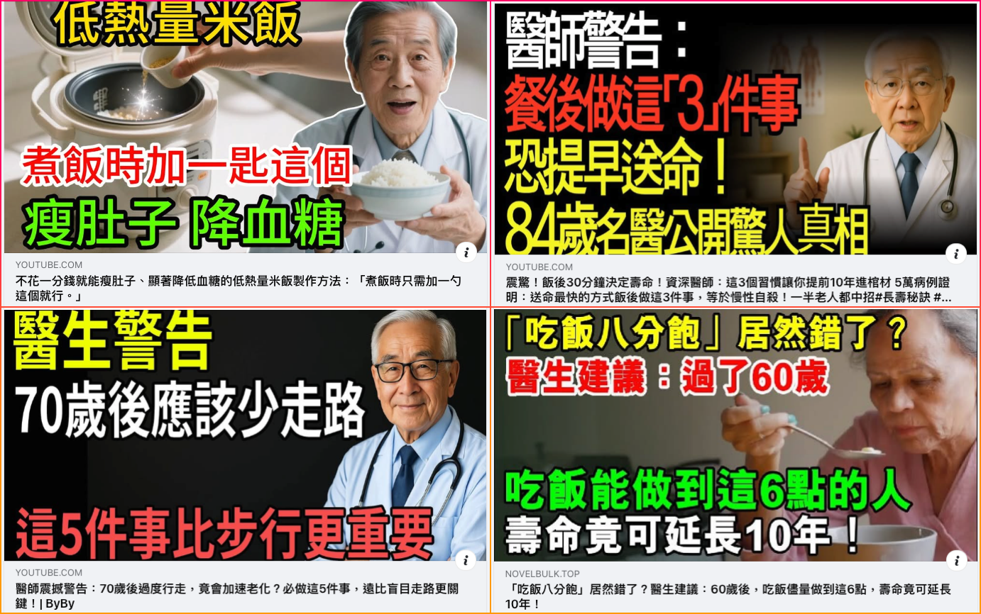網傳各種有關健康養生的方法,舉凡飯後不要激烈運動、不要吃太飽、睡眠充足、每日一萬步反害膝關節炎、注重蛋白質攝取、喝水不能喝太少等養生之道,再搭配誇大聳動的標題,事實上這些 YouTube 影片部分情境與人物為 AI 生成,缺乏脈絡的資訊易造成誤解。醫師建議,看到這些似是而非的網路傳言內容,應以平常心看待,對於相關的作法也抱持過猶不及的態度,若有疑義,應尋求醫生、營養師、護理師等專業人員的協助。並非所有健康之道都一體適用,誤會為可以套用在每個人身上。