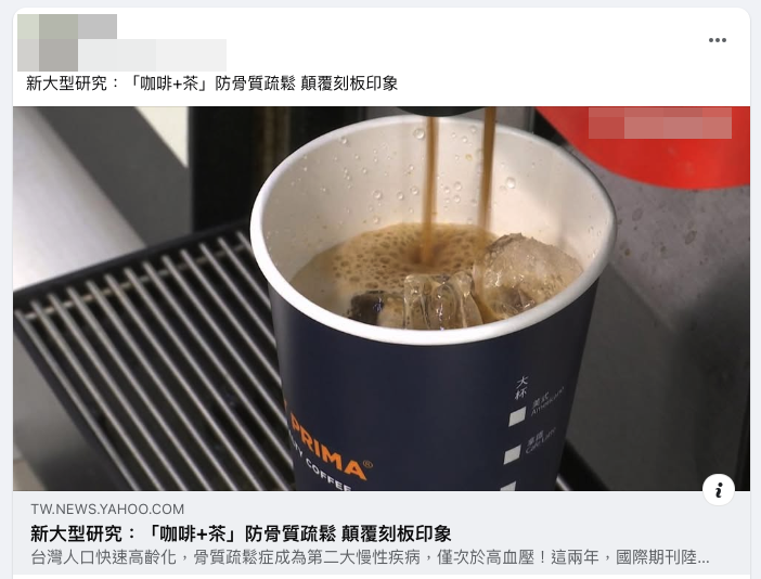 網傳訊息宣稱:「新大型研究:咖啡+茶」、「防骨質疏鬆 顛覆刻板印象」,並引用英國資料庫分析結果指出,每天喝 1 至 2 杯咖啡可降低骨質疏鬆風險約 10%,若再加上每天喝茶,還能降低達 32%。對此,醫師表示,無論是咖啡中的綠原酸或茶中的兒茶素,這些抗氧化成分都能抑制發炎、都有一些好處,但不能直接宣稱可預防或治療骨質疏鬆。傳言提及「促進造骨細胞活性」的說法,造骨細胞、蝕骨細胞機轉都必須是藥物等級才能有實質意義,食品不能宣稱療效、傳言說法易造成誤解。