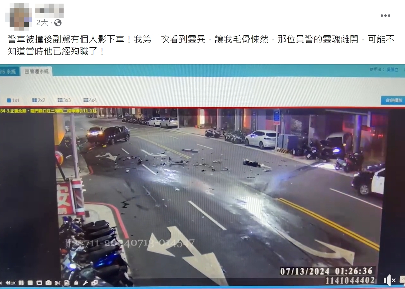 警車撞停後副駕有個人影下車(騎樓下的警車)那位員警的靈魂離開可能不知道當下自己已經殉職了