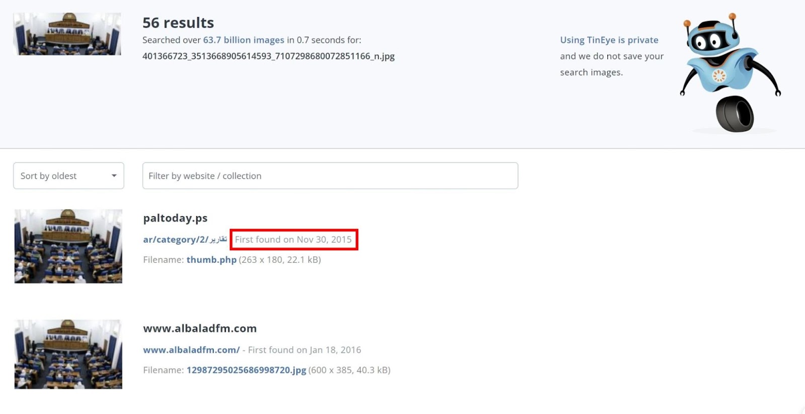 利用圖片反搜工具「 TinEye 」進行反搜,可以找到許多網站有使用這張照片,至少於 2015 年即在網路上流傳;《巴勒斯坦資訊中心》( The Palestinian Information Center ) 2015 年 5 月的報導即有使用這張圖片,可以確認是加薩巴勒斯坦議會( Palestinian Legislative Council, PLC )的照片。