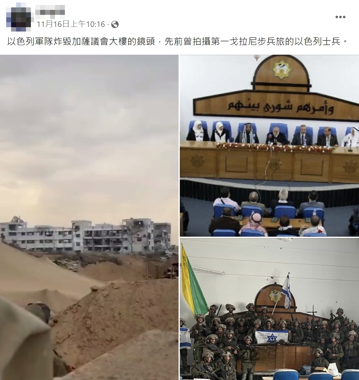 網傳「以色列軍隊炸毀加薩議會大樓」的影片及訊息,畫面是以色列軍隊炸毀一棟建築物,聲稱是加薩議會大樓。經查證,網傳影片遭炸毀的建築物並非議會大樓,影片拍攝地點位於加薩走廊 Juhor ad-Dik 區,該地距離加薩議會大樓約 7 公里,兩者並無關聯;不過根據 11 月 15 日國外媒體及衛星影像顯示,加薩議會確實已遭摧毀,前方的公園也被夷平,傳言將議會遭摧毀的消息,搭配不相干的影片,容易造成民眾誤解。