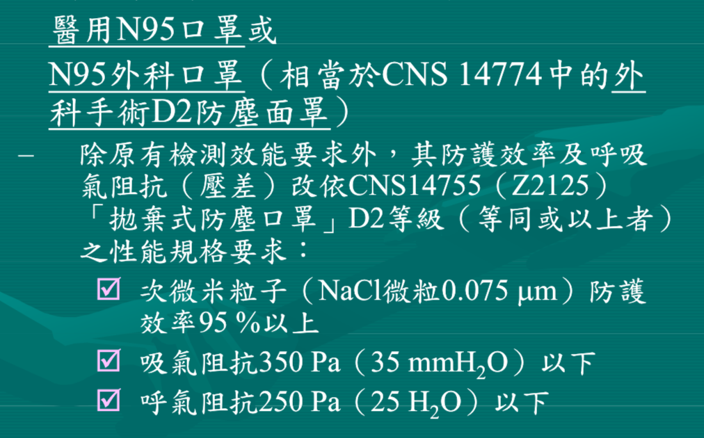 林嘉謨以民眾常聽到的 N95 口罩為例,N95 的意思是指對次微米粒子的過濾效果最低可達 95% 以上,傳言所說口罩內二氧化碳太高是指 N95 以上等級的口罩才會有這種問題,醫界使用 N95、甚至 N100 的口罩,都是胸腔科醫護人員用在照顧肺結核病患,或者進入新冠隔離病房時使用,而且戴好 N95 口罩之後還要壓著封條,用力吐氣確保不會有空氣沿著邊緣洩漏,N95 這樣的密封標準才會有口罩內氧氣下降、二氧化碳升高的問題。