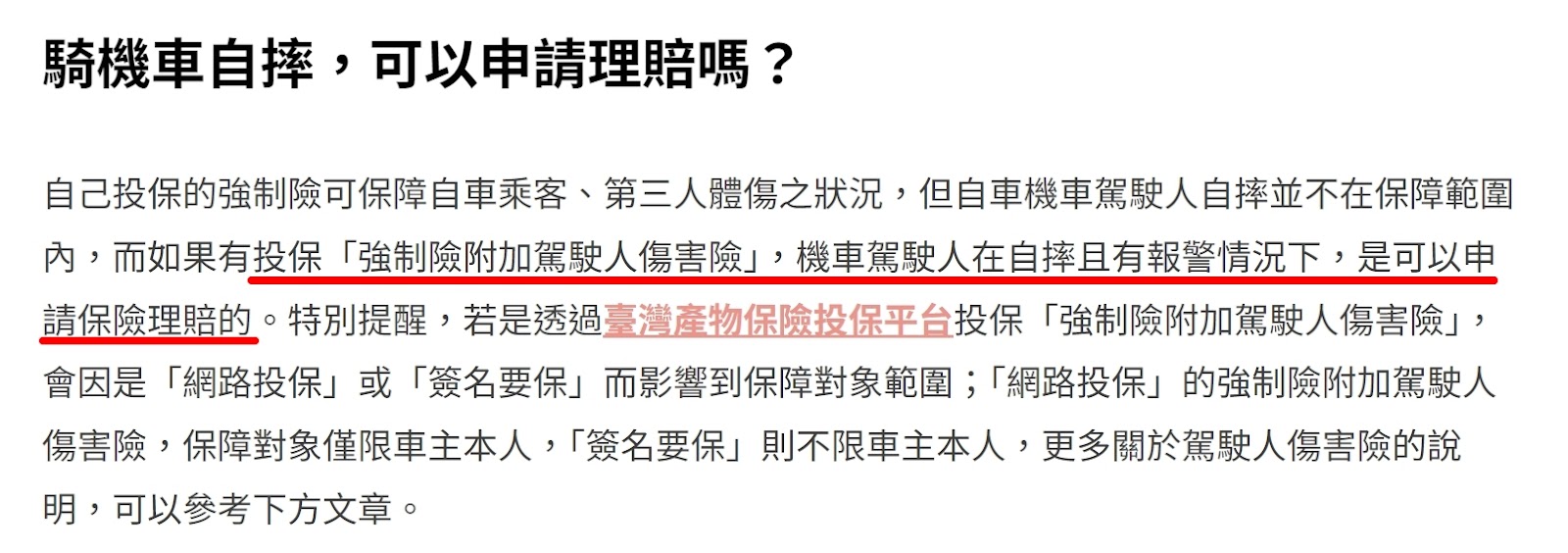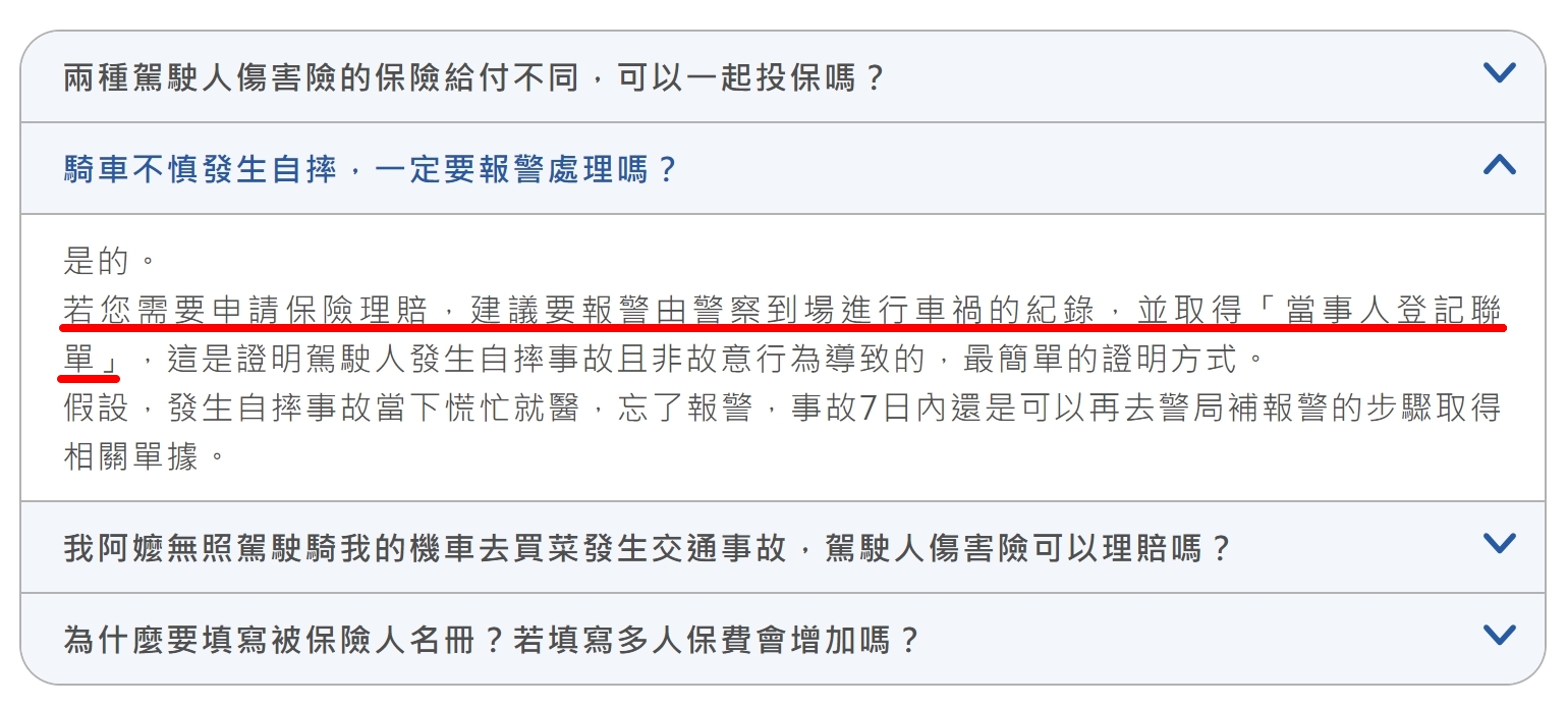 而投保駕駛人傷害險,自摔欲申請理賠,保險公司會要求「當事人登記聯單」,也就是報警請警方來車禍現場的紀錄,目的是證明駕駛人發生自摔事故而非故意行為所導致,如果是其他車輛造成車禍,則屬於強制險或第三人責任險範疇。