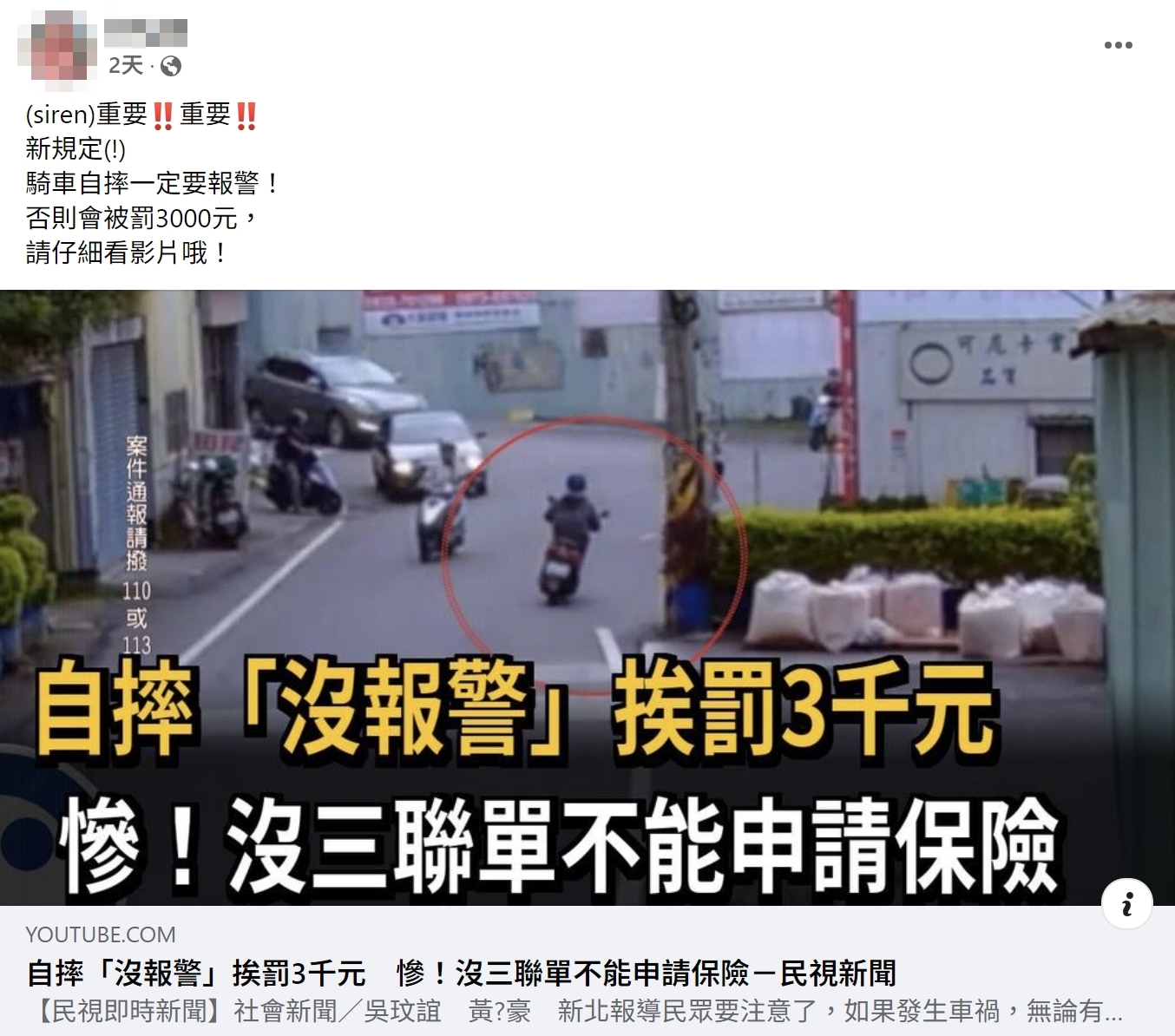 MyGoPen 檢視網傳訊息所附連結,可以找到民視新聞於 2024 年 8 月 24 日在官方 YouTube 頻道發布的影片《自摔「沒報警」挨罰3千元 慘!沒三聯單不能申請保險》,內容提到新北市一名男子騎車自摔,事後因保險理賠需要報案三聯單,因此向警方申請,結果被警方先開出一張 3,000 元罰單後才受理申請。