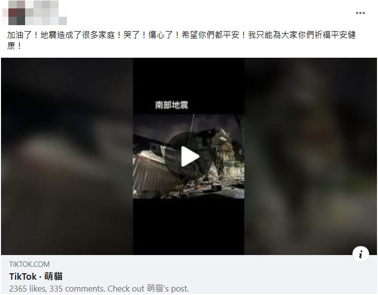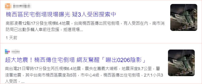 網傳「台南民宅三棟倒塌」的訊息和照片,還有媒體的相關報導。經查證,媒體使用的一張建築物倒塌照片,其實是 2025 年 1 月 6 日新北市三重區建案開挖導致鄰宅受損、傾斜倒塌的畫面,和 1 月 21 日 南臺灣發生芮氏規模 6.4 地震無關;此次地震確實造成台南楠西多戶民宅倒塌、嘉義大埔道路坍方中斷等情況,但傳言為無關照片。