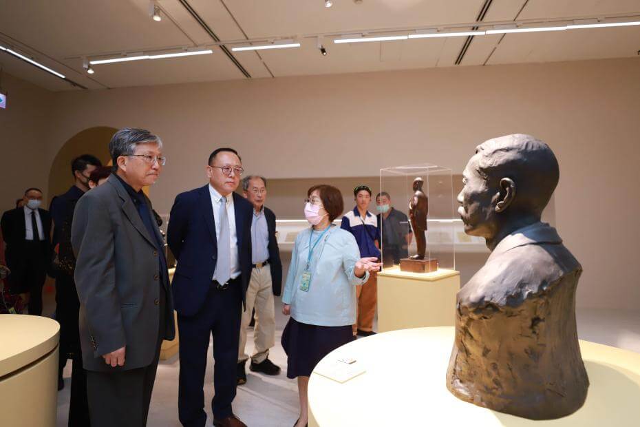 文化部長史哲(左1)在國美館館長廖仁義(左2)導覽下,參觀「臺灣土‧自由水:黃土水藝術生命的復活」展覽。圖/國立臺灣美術館提供