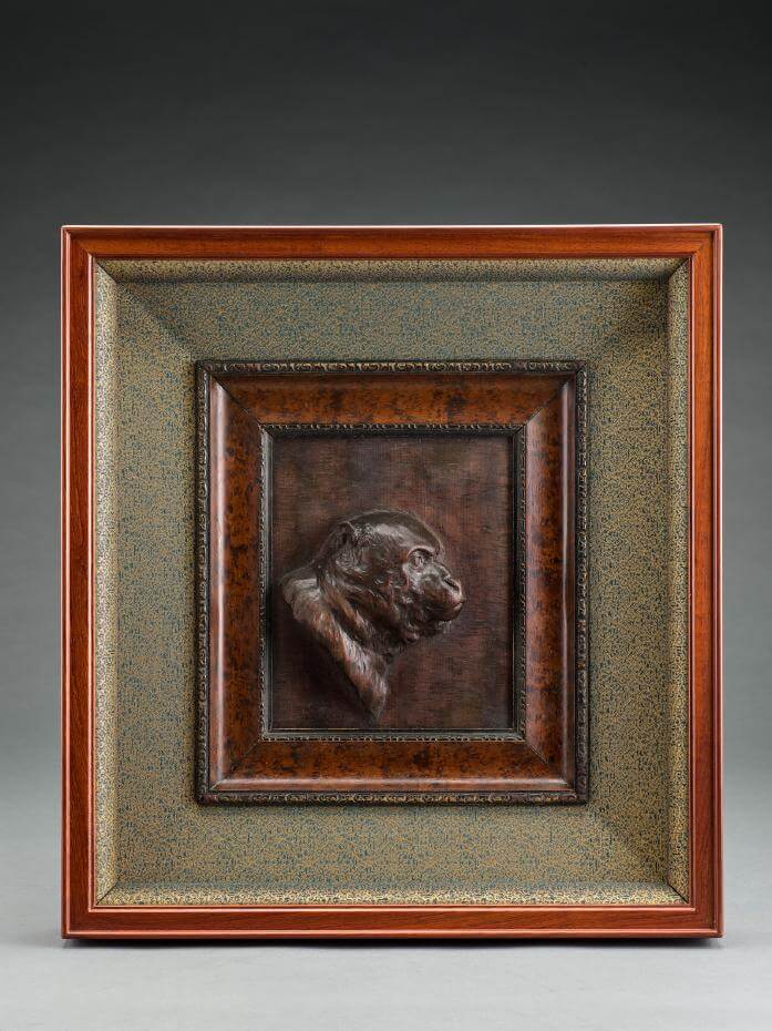 黃土水,《猿》,1927,木,18.5times23 cm,私人收藏,框: 54.8x50.8x10.4(厚)cm。圖/國立臺灣美術館提供