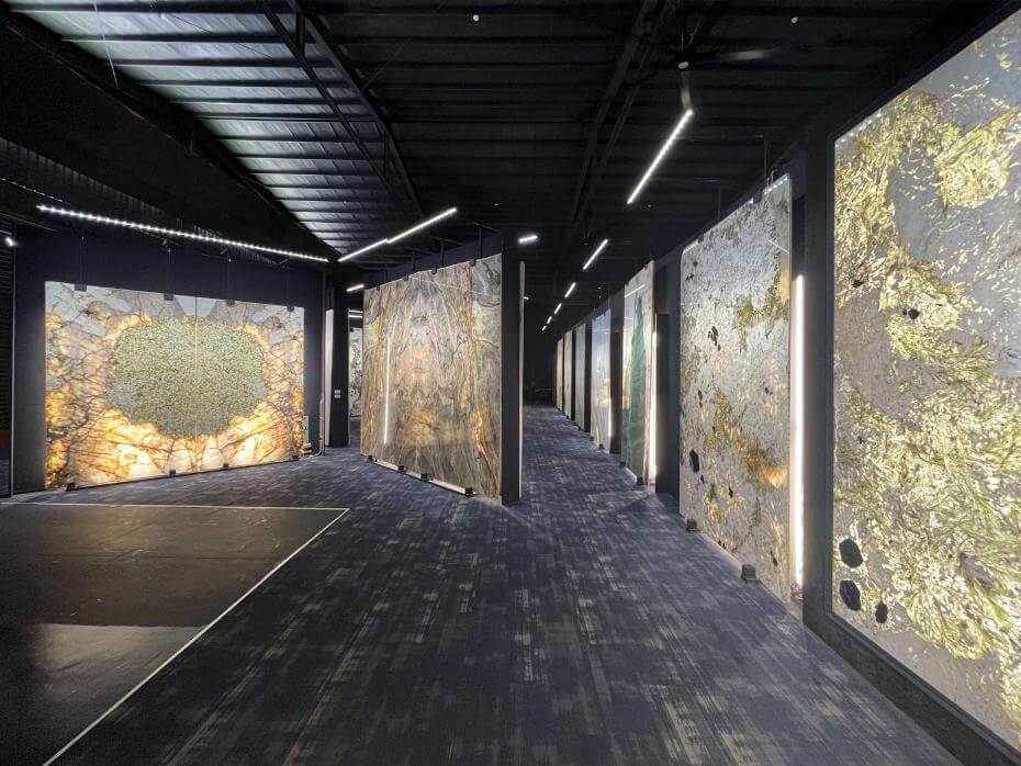 在空間規畫上,承豪石材銜接了開放倉儲區與展示區,共展示了上百種來自不同地方的石材。開放倉儲區可以看見一塊塊原石裁切的「大版」並置,讓參觀者能夠看見同一塊原石不同切面的連續性與變化性。而在展示區,不但介紹了許多石材的故事,也以直立、背後透光的方式,呈現出了大理石進入家居中最美麗的樣貌。