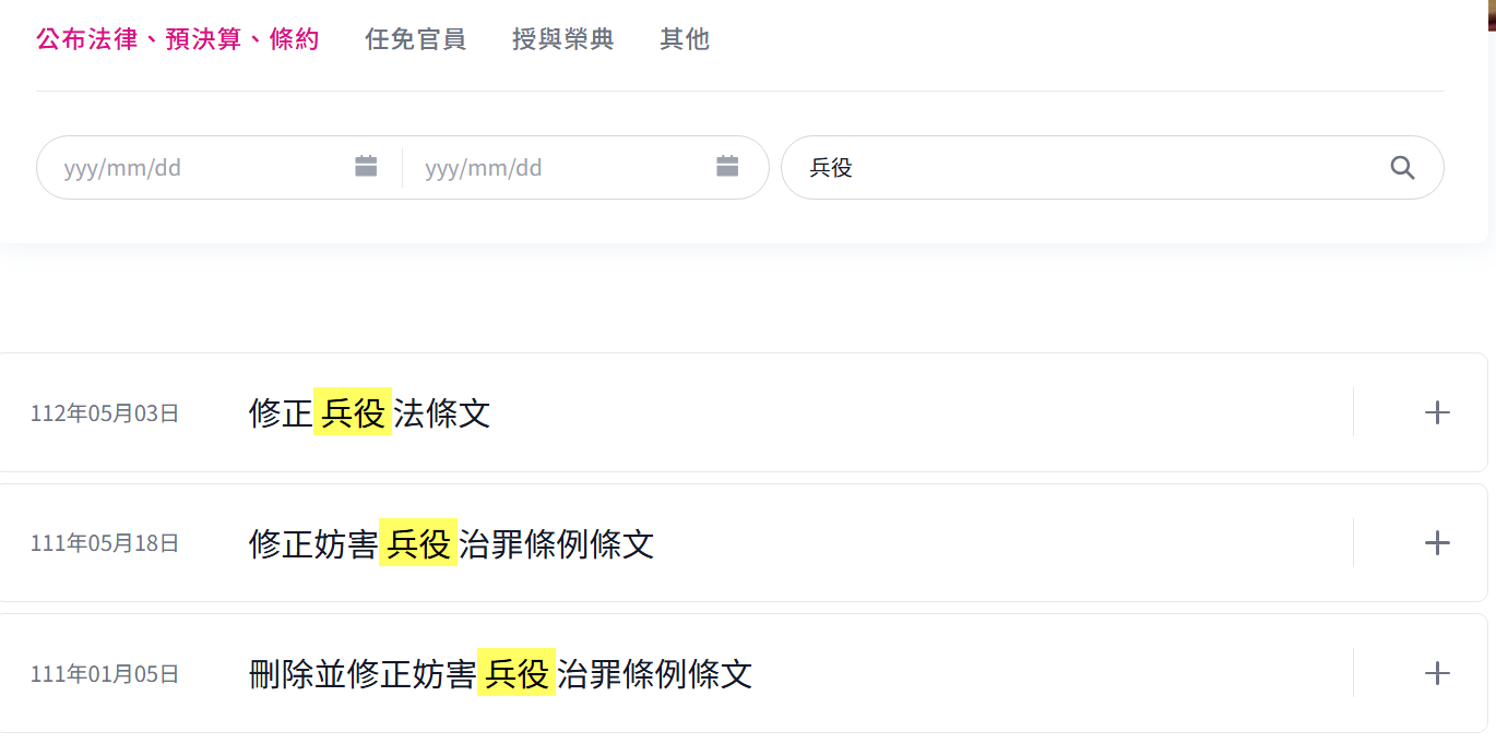 (二)自2025 年 1 月至本篇查核報告截稿前,總統府均無公布和兵役法有關的修正條文;以關鍵字進行搜尋,目前為止,最新一次公布兵役法修正條文是 112 年(2023 年)5 月 3 日,當時的總統是蔡英文,修正內容為兵役法第 44 條,主要調整國民為國服兵役時之權利;賴清德總統自 2024 年上任至今,尚未發布和兵役有關之總統令。