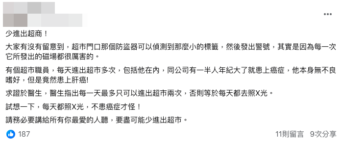 網傳「少進出超商!大家有沒有留意到,超市門口那個防盜器可以偵測到那麼小的標籤,然後發出警號,其實是因為每一次它所發出的磁場都很厲害的」的訊息。經查證,此傳言是資深謠言,至少在 2011 年時就開始流傳,當時已有媒體採訪多位專家學者報導澄清;超市賣場等一般商家使用的防盜門是運用 RFID 無線射頻技術,國立成功大學電機工程學系特聘教授李順裕解釋,RFID 的原理是感應式的傳輸方式,其頻率範圍和 X 光不同,沒有輻射問題,傳言為錯誤說法。