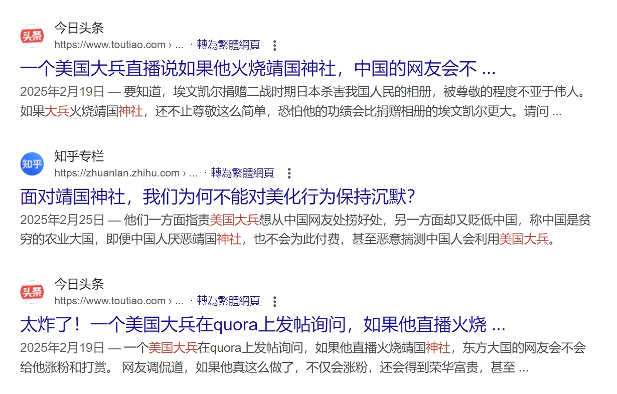 網傳「美國大兵揚言直播火燒日本靖國神社」的影片及訊息,內容聲稱一名駐日美軍日前開直播,聲稱將於 2025 年 3 月 8 日直播燒靖國神社,引起社群瘋傳,短短 3 天增加了 500 萬粉絲。經查證,網傳訊息是由 2 月初在中國社群流傳的謠言「美國大兵揍韓國人漲粉」演變而成,大約在 2 月中中國網友在小紅書發文,徵求駐日美軍拆除靖國神社,聲稱可以獲得大量粉絲及贊助,隨後在內容農場、短影音推波助瀾下,讓不少人誤以為真有此事。實際上,網路上流傳的「美國大兵」影片,只是一名有在經營 TikTok 帳號的職業軍人「zappatockie」,他從未討論過與靖國神社有關的話題;另一支民眾在靖國神社前發生衝突的片段,是 2021 年的影片,並非近期拍攝,網傳訊息從頭到尾都是捏造的內容,並非真實事件。