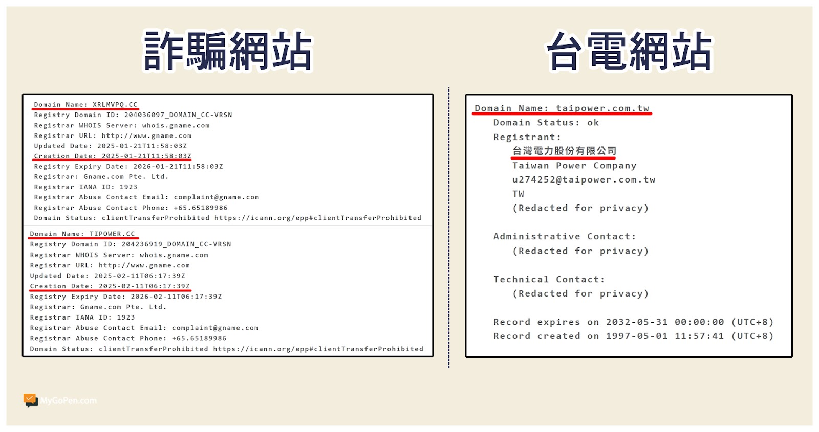 此外,透過財團法人台灣網路資訊中心「Whois 查詢」,會發現圖片中的網址分別於 2025 年 2 月 11 日及 1 月 21 日才架設,明顯不是台電的網頁;若是以同樣方式查詢正式活動頁面(service.taipower.com.tw),可以看到該網址的網域顯示為「taipower.com.tw」,註冊人為「台灣電力股份有限公司」,且至少 1997 年以來即有網站記錄。