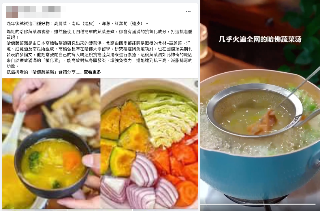 網傳「爆紅《哈佛蔬菜湯食譜》」,提到以「高麗菜、洋蔥、紅蘿蔔及南瓜」煮成一鍋湯,每天喝一碗植化素滿滿的蔬菜湯就能有排毒、增強免疫力、不易感冒、預防癌症、防止動脈硬化、降三高等各種功效。但專家表示,上述四種食物都是營養價值很高的蔬菜及根莖類,但同類或是具有相同營養價值的蔬果還有非常多,傳言只提到四種卻未強調替換品項、多元均衡的營養觀念,易使民眾誤以為每天喝一碗就足夠,或是排擠其他種類蔬果的攝取,造成份量及多樣性的不足、易生誤導。