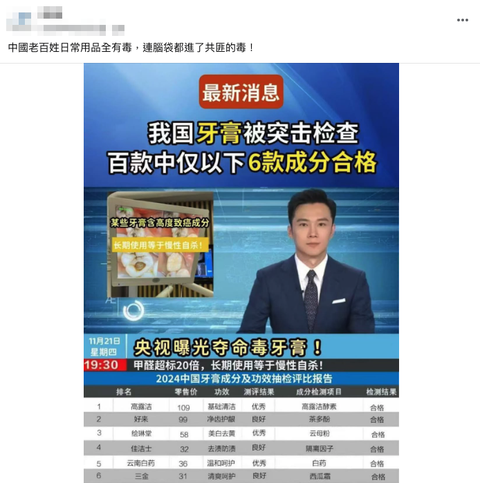 【錯誤】央視曝光奪命毒牙膏?長期使用等於慢性自殺?後製畫面非真實報導