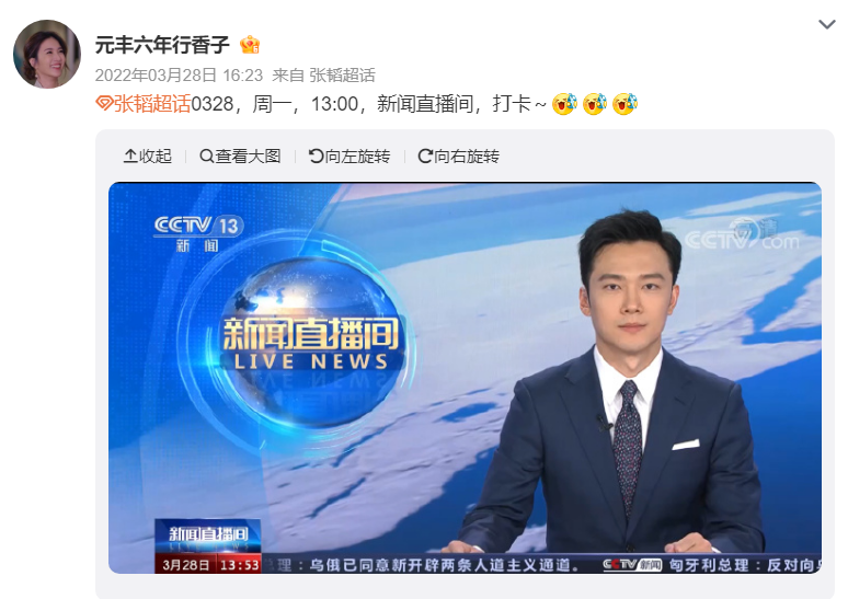 (二)由於張韜本人的微博帳號設定僅展示半年內的內容,查核記者從微博的超級話題貼文進行比對,發現他主持《新聞直播間》的畫面和傳言圖片較相符;其中2022 年 3 月 28 日的穿著和網傳畫面相同,但網傳圖片的日期卻顯示為 11 月 21 日。