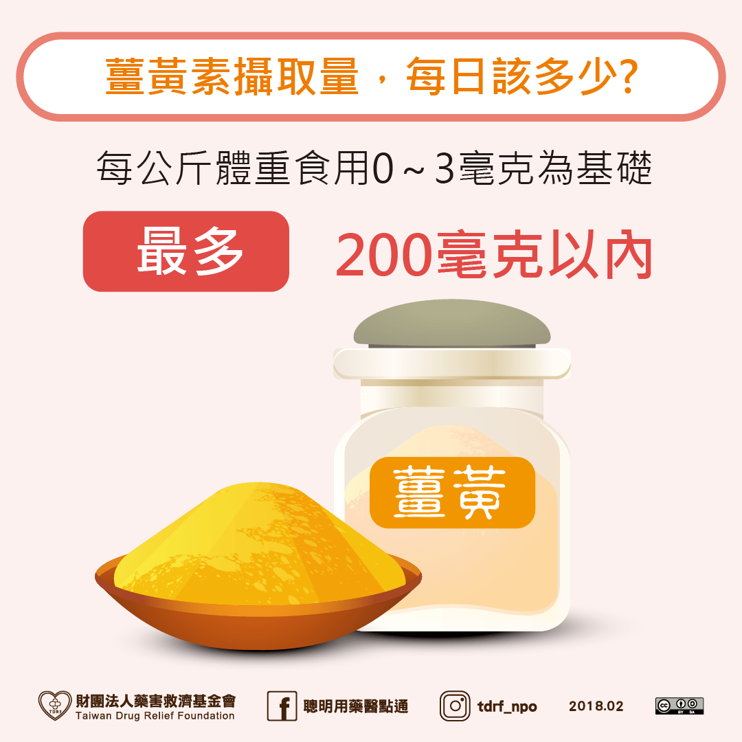 食藥署於 2018 年 2 月發布「正確使用薑黃素 聰明食用免傷身」,食藥署委由中國醫藥大學附設醫院的專家們撰文,共同宣導如何正確使用薑黃素: