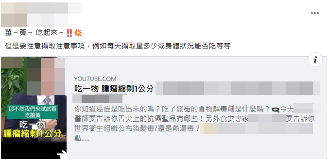 網傳「吃一物 腫瘤縮剩一公分」影片,片中提到大腸癌癌第三期病患,開刀、化療後卻發生肝臟轉移,後續改吃薑黃每天 500 毫克,5 個月後腫瘤變縮小到 1 公分。但專家表示,薑黃的相關研究大多是細胞實驗、動物實驗,人體實驗仍為「部分人體實驗」,食藥署自 2017 年起就開始不斷衛教,官方宣導的立場為「薑黃預防、治療癌尚需更多研究佐證」,專家及食藥署也提醒,薑黃具刺激性,攝取過量可能會有腹瀉、噁心、胃潰瘍、結石等副作用,不建議孕婦與哺乳婦女及腎臟疾病、胃潰瘍、膽管堵塞等患者食用薑黃。