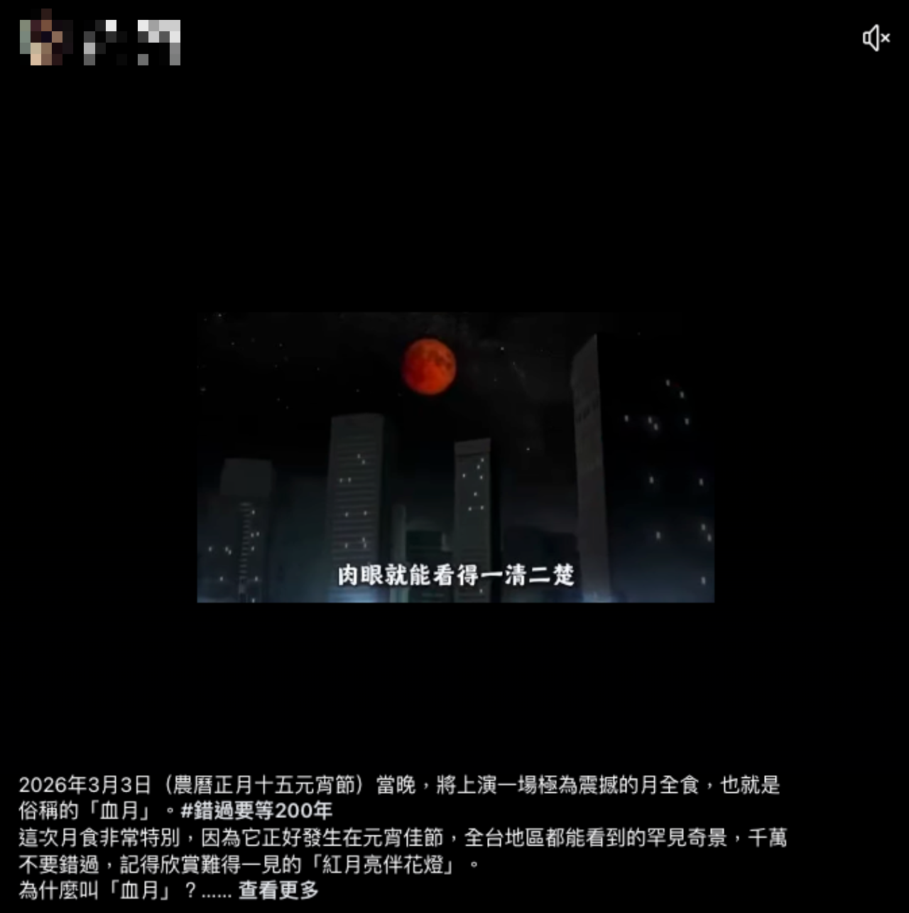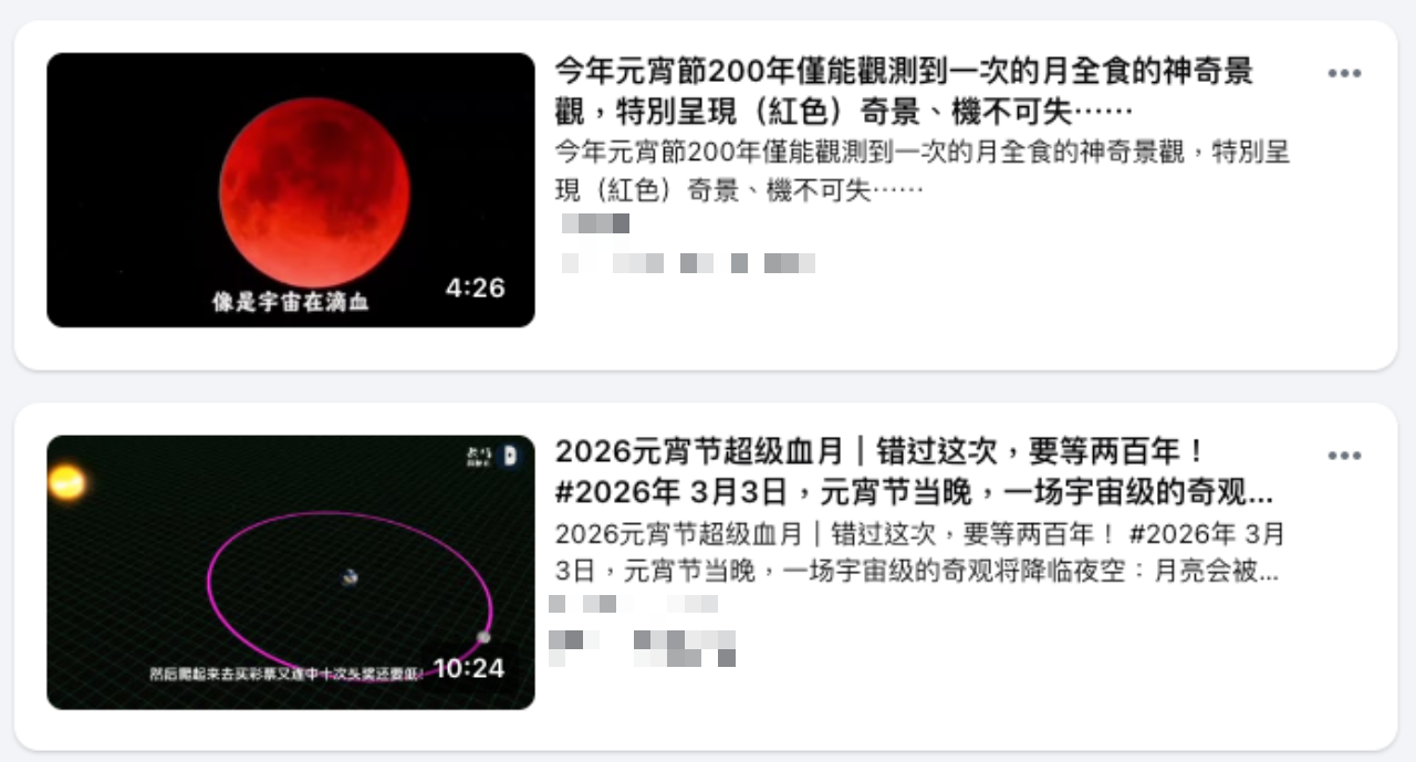 網傳「2026 年 3 月 3 日元宵節晚上要好好把握」、「200 年一次的月全食的畫面」的訊息。經查證,根據氣象署統計,台灣在本世紀(2001 ~ 2100 年)可以看到 63 次月全食,下次可以見到全程月食的時間是 2028 年 12 月 31 日;另根據「Time and Date」網站資料,下次元宵節發生月全食的時間是 2036 年 2 月 12 日,大約 10 年後,傳言說法為錯誤資訊。