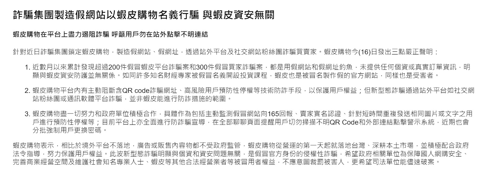 由於近幾個月來,已發生 200 多件假冒蝦皮平台詐騙和 300 多起假冒買家詐騙案,蝦皮購物於 3 月 16 日發出聲明,呼籲用戶不要點擊來路不明的連結或是 QR Code。