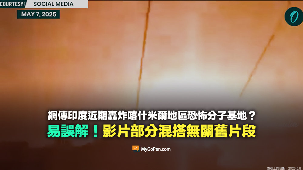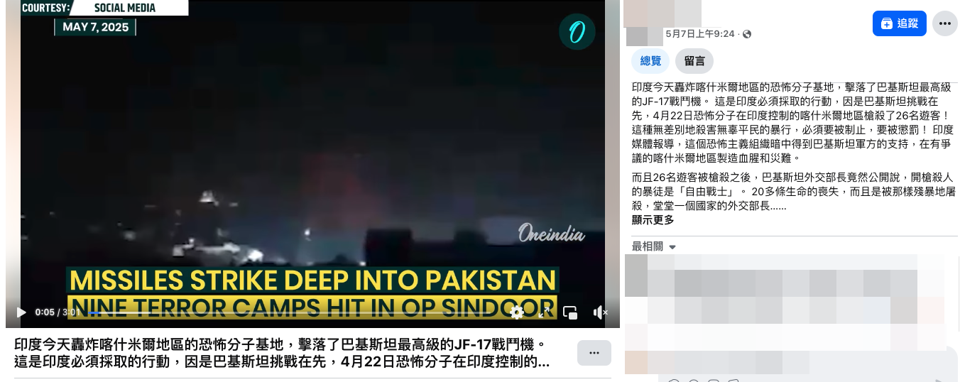 網傳「印度今天轟炸喀什米爾地區的恐怖分子基地」、「擊落了巴基斯坦最高級的JF-17戰鬥機」的訊息和影片。經查證,網傳影片中的轟炸畫面主要有 5 個片段,但其中含有 2023 年加薩地區的舊影片,並非 2025 年 5 月 7 日印度對巴基斯坦發動的「辛多爾行動」;2025 年 4 月 22 日,印控喀什米爾地區發生恐怖攻擊,造成 26 名平民死亡,印度調查發現恐攻犯人至少有 3 個巴國人,因此在 5 月 7 日針對巴國境內的 9 個恐怖份子基地進行反擊,之後雙方持續交火。目前網傳影片部分拼接舊片段或錯誤時間點,與「辛多爾行動」無關。