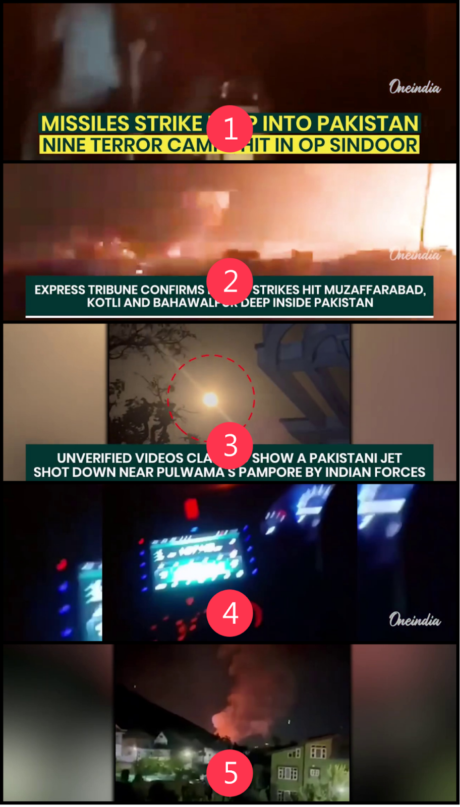 根據報導,印度針對巴基斯坦境內的 9 個恐怖份子基地進行反擊,這些基地都和印度境內遭受的攻擊有關;新聞影片主要介紹辛多爾行動攻擊的這 9 個地點,其中也出現和片段一、四相同的畫面。