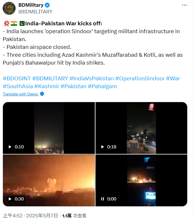 (二)透過影片反搜工具 InVID 分析網傳影片的關鍵畫面後進行搜尋,查找到 X 帳號「BDMILITARY」在 2025 年 5 月 7 日發布一則推文,指出印度對巴基斯坦發起「辛多爾行動」(Operation Sindoor),並附有 4 段影片,4 段影片中就有 3 段和網傳影片內容相同,分別是片段一、二、四。