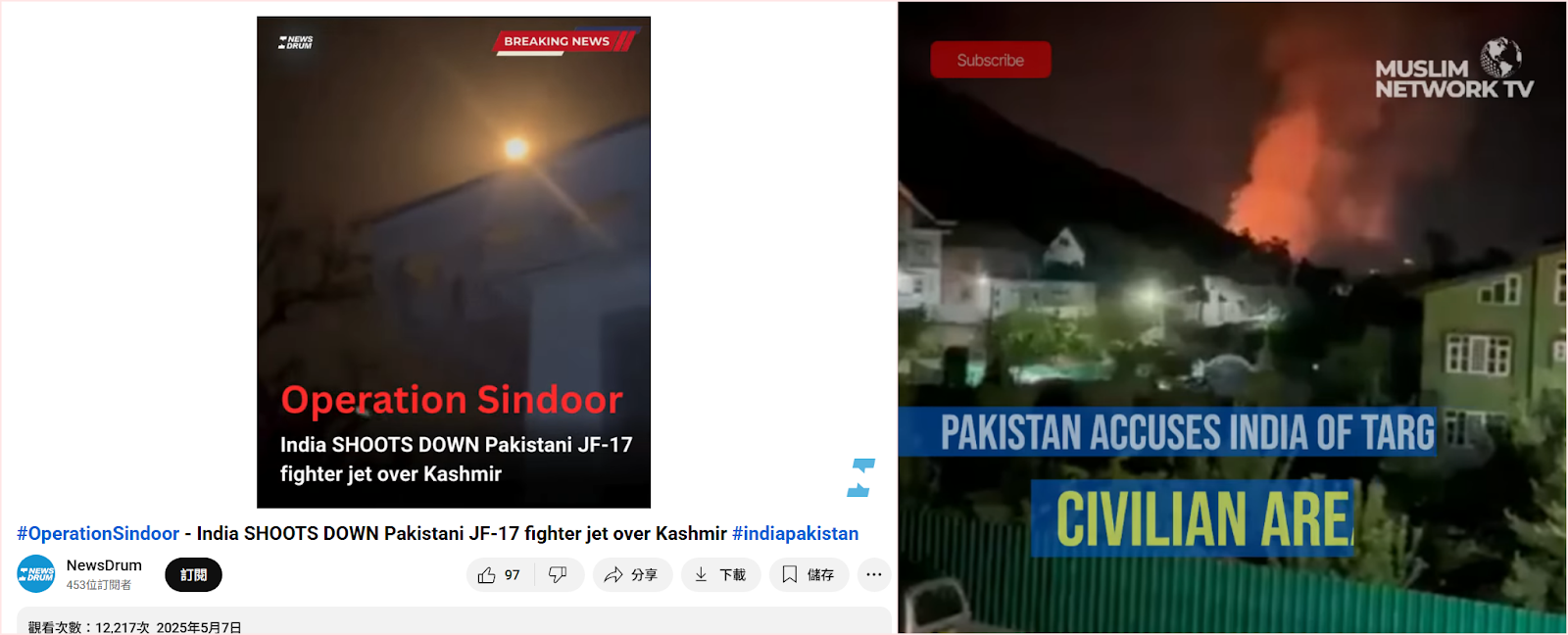 (五)片段三經反搜,可查找到印度媒體《NewsDrum》有相關報導,根據新聞內容指出,這是印度在喀什米爾上空擊落巴基斯坦 JF-17 戰鬥機的畫面;片段五經反搜,也有出現在美國媒體《Muslim Network TV》的 Instagram 貼文影片中。