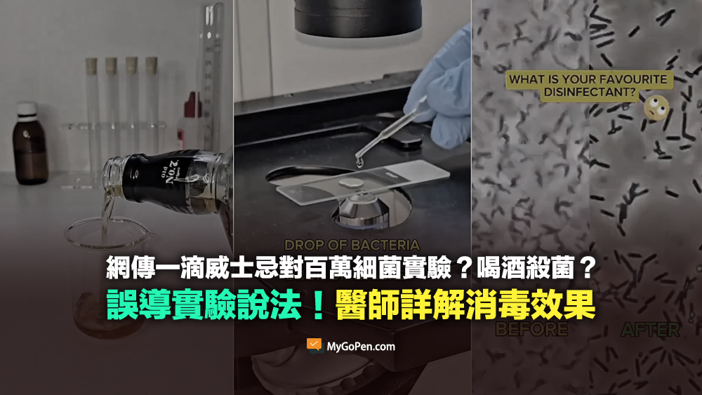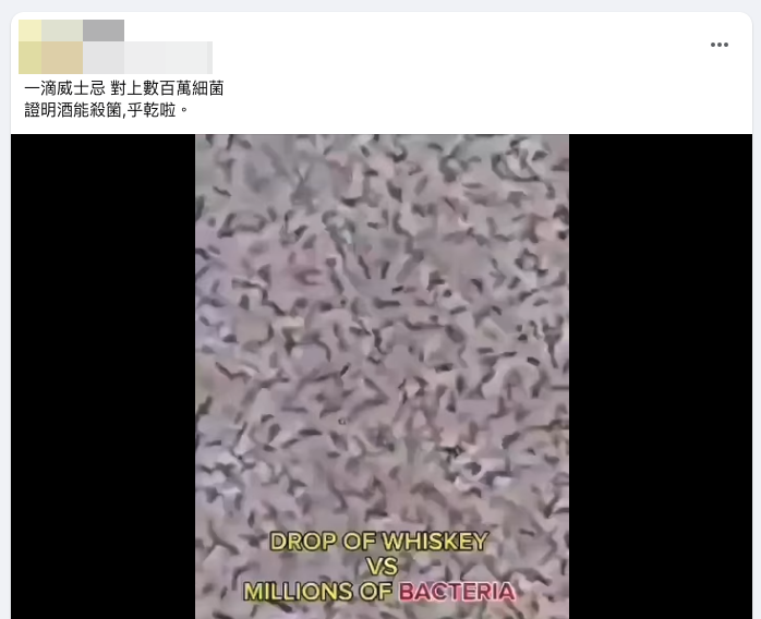 網傳「一滴威士忌對上數百萬細菌,證明酒能殺菌」貼文,以及顯微鏡頭下威士忌酒讓細菌活動力降低、不動的畫面。專家表示,威士忌酒或是其他烈酒要拿來消毒只能是應急使用,現在不是戰爭或是物資缺乏的時候,沒有必要捨便宜好用的 75%消毒酒精不用、而去使用昂貴的威士忌酒;提醒民眾,即使 75%酒精已經是實證消毒效果最好的濃度,但對腸病毒、諾羅病毒等就無效。