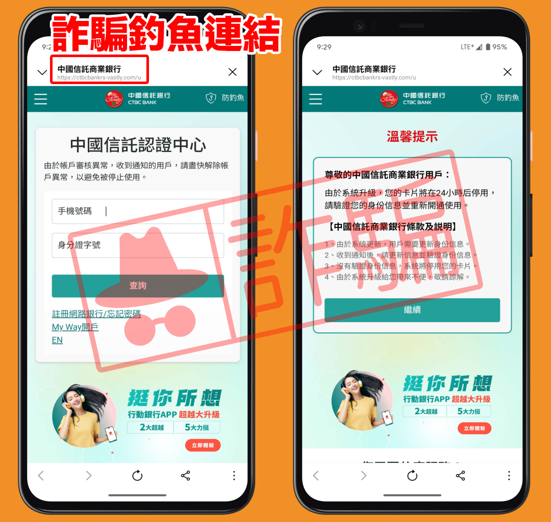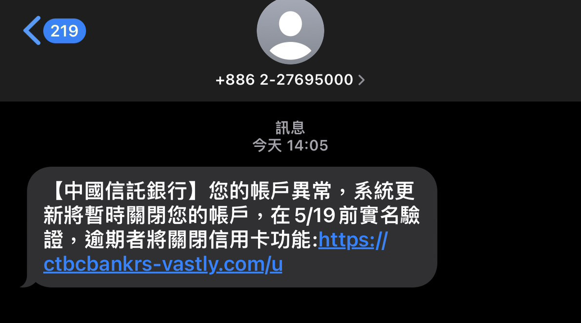 近期民眾回報收到偽冒中國信託銀行的簡訊,內容聲稱帳戶異常,要求完成實名驗證,否則將暫停帳戶與信用卡功能,看似來自銀行電話的簡訊中還夾帶了一組如官方網站的連結。事實上這是詐騙集團誘導民眾點擊進入釣魚網站的手法,該網站是為了竊取個資與信用卡資訊而設計。警方提醒,來自市內電話號碼的簡訊必是詐欺,另外銀行不會主動以任何名義要求顧客提供資料進行驗證,務必多方確認,切勿填入個資,以免信用卡遭到盜刷。