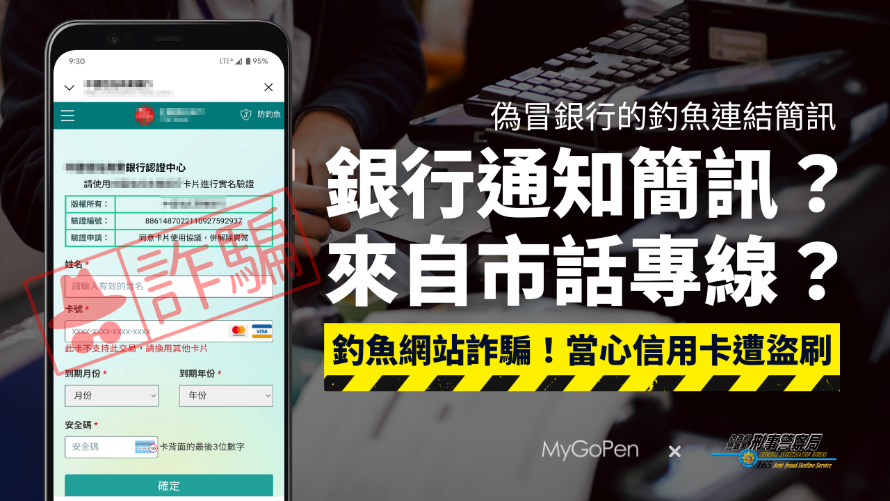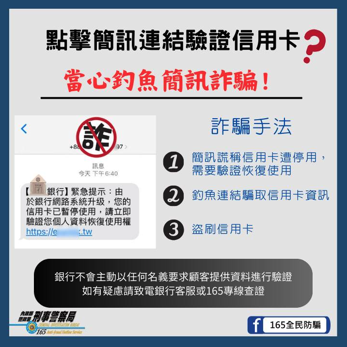 警方提醒,銀行不會主動以任何名義要求顧客提供資料進行驗證,如有疑慮應致電銀行客服(信用卡背面有客服專線),建議直接聯繫銀行官方客服或使用官方 APP 驗證,或利用 165 專線查證。