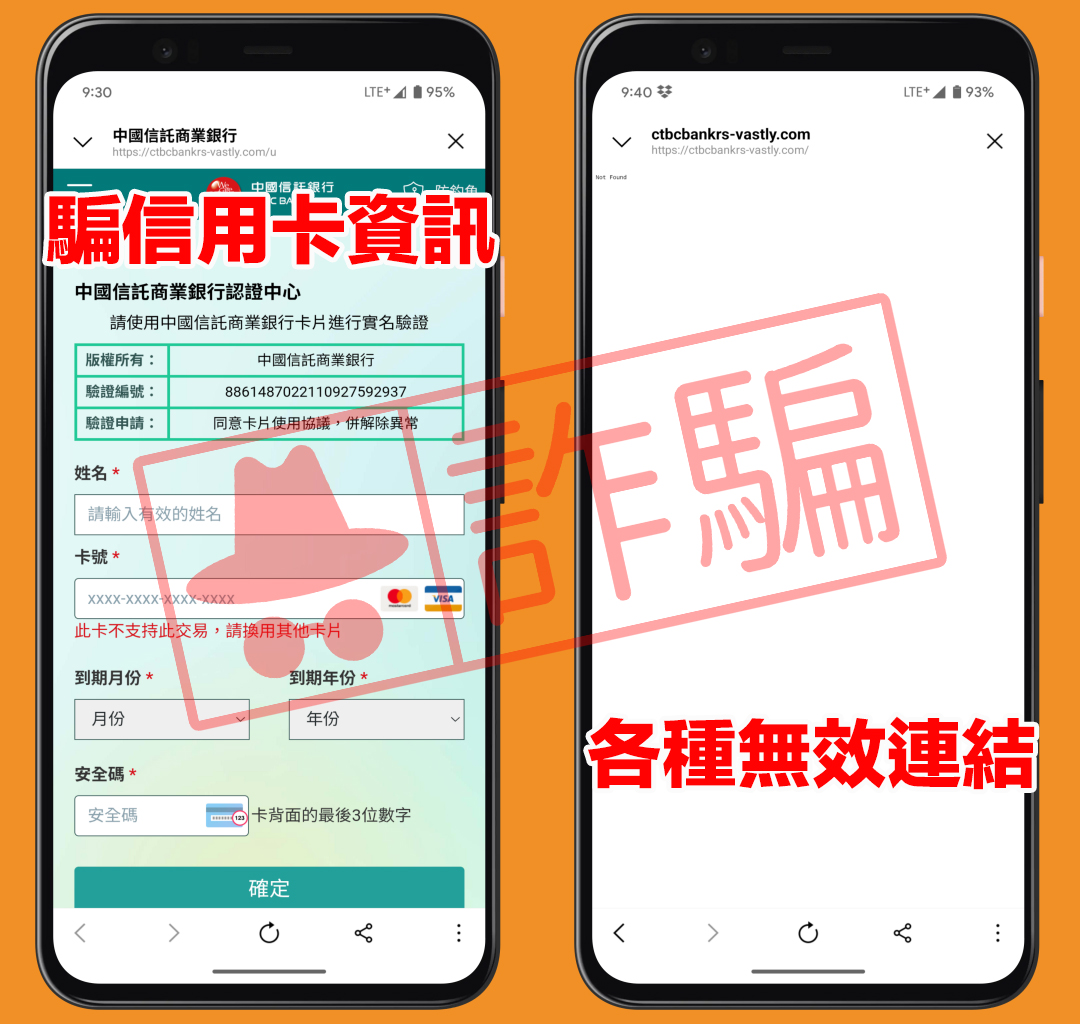假網站有需多失效連結,另外銀行不會透過簡訊要求點擊連結進行「實名驗證」或提供完整卡片資訊,而詐騙釣魚網站會要求填寫姓名、卡號、有效期限與安全碼等敏感資訊,一旦不小心填入這些資訊,就可能導致信用卡被盜刷。